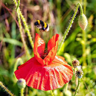 Nearby, a bumblebee circles and lands on a bright red poppy. The light comes in from the side – I pull back the exposure slightly to retain the color. One lucky second. One image that stays.